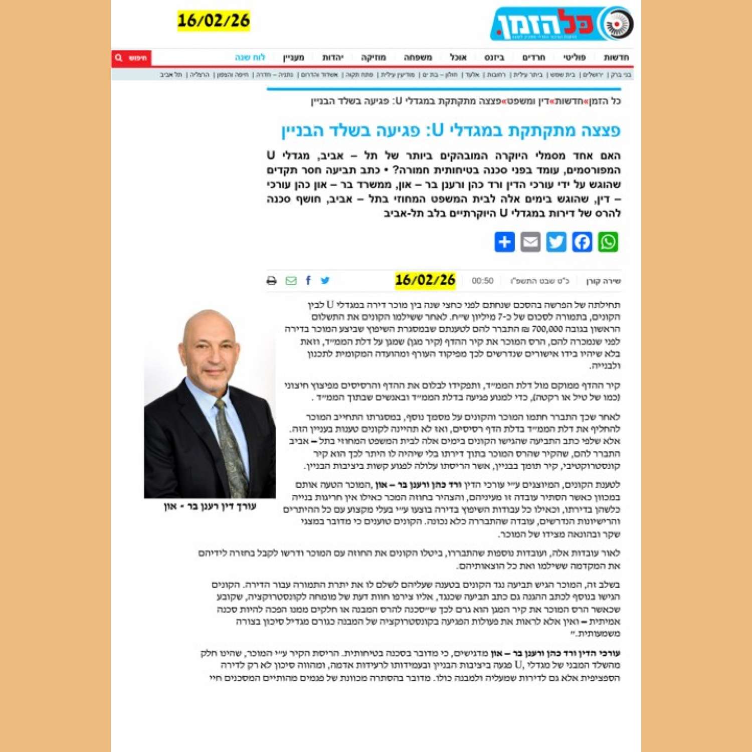 | 7878 | 16.02.26 - | פצצה מתקתקת במגדלי U: פגיעה בשלד הבניין - עמ... |